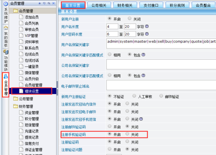 2、打开DESTOON B2B网站管理系统后台-》会员管理-》模块设置-》基本设置,注册验证码功能开启;