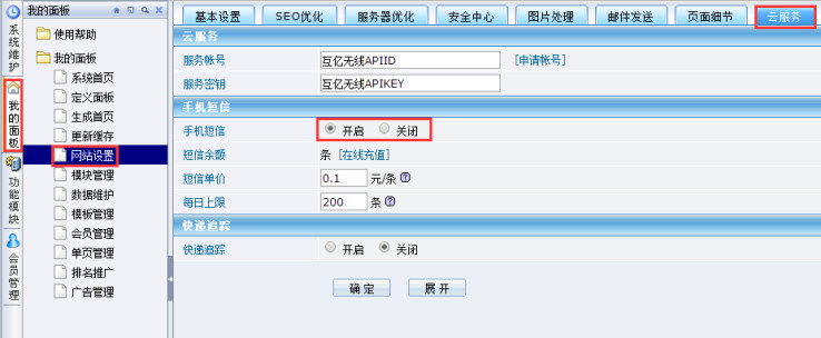 3、打开DESTOON B2B网站管理系统后台-》我的面板-》网站设置-》云服务,手机短信功能开启。